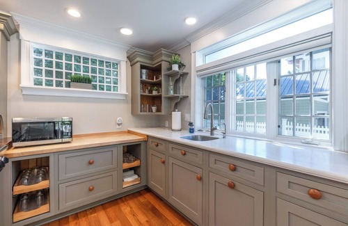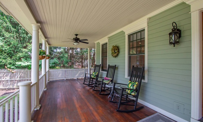 You can walk everywhere, the car will never leave the driveway all weekend long. Plenty of street parking as well. Super home for entertaining or a great getaway weekend with friends. Cozy and Comfortable Bedding and furniture. Four of the bedrooms have en-suite bathrooms and great for couples privacy. Separate suite area on third floor with two bedrooms. Beautiful lounge and fireplace in the kitchen area, complete wrap around Saratoga porch, skylights, amazing wood floors, astounding Victorian woodwork everywhere you look. Over-sized "man-cave" garage and awesome yard.