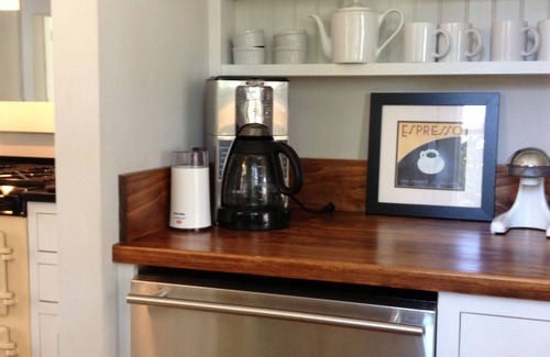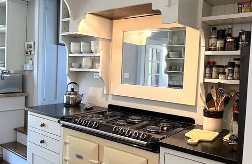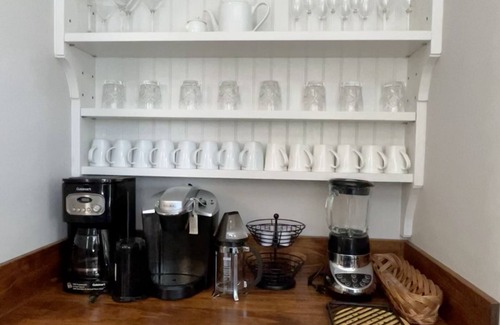 Wine/coffee pantry has wine glasses, Keurig coffee maker +automatic drip (Mr Coffee)+ French Press, stainless-steel 2-drawer drinks refrigerator. The well-equipped kitchen has the iconic Aga cooker (4 ovens, 6 burners, custom paneled exhaust hood), 36" stainless steel Sub Zero refrigerator, and honed granite countertops. Ample quality cookware, dishes, flatware, small appliances, glassware, table linens, kitchen linens, spices, condiments, paper goods, and laundry supplies.