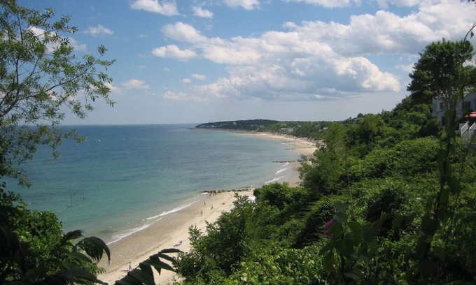 This amazing house has 5 bedrooms (all with ocean views) 3 bathrooms. House by the Sea is decorated in restrained Nantucket style. Its oceanfront living room has a gas fireplace, wainscotting, beams, paintings, and books. The living room opens to the beamed dining room with ocean views and charming Oceanview bay window seats. There is something special about seeing the ocean surf, bluffs, and beach through 100-year-old wavy glass.