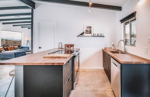 Spend your evening cooking inspired meals and lose yourself in deep conversation or quiet contemplation under a star-laced sky listening to the songs of desert coyotes rising from the valley below. The land and surrounding hills are dotted with Joshua Trees and full of vibrant desert flora and fauna. It’s located 5 minutes from Old Town Yucca’s main commercial strip with restaurants and shops. Pioneertown is a short 13 minutes away and Joshua Tree center and the national park are 15-20 minutes, respectively.