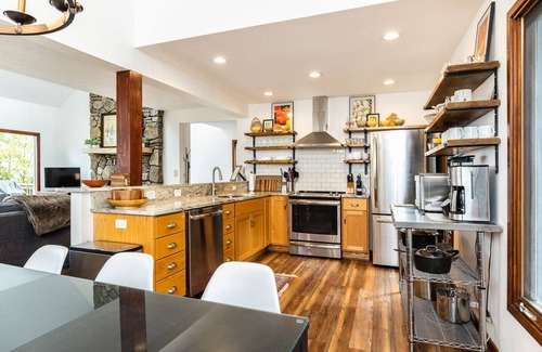 Once inside, you'll find everything you need on one level: two bedrooms (one master/king room with adjoining sunroom and one twin room) share an updated hall bath with tub/shower combo. There is a main-floor office nook with printer and a lovely mountain view, while the heart of the home features a vaulted great room with a stunning mountain view and decorative fireplace adjoining an all-new, on-trend kitchen (c. 2019 with stainless, marble, open shelving, All-Clad, Le Creuset, Nespresso, Keurig, and more). The dining table seats six, while four more can comfortably sit at the breakfast bar.