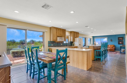 The manicured backyard with oversized pool and jacuzzi area provides a private amphitheater to unwind outdoors under the sunny/starry Southern Arizona skies. ( Pool ad Spa heating fees are optional, and will be added AFTER booking if requested. Fee schedule is below in additional house rules) Dine under the covered patio, or relax indoors with calming southwestern-style décor, clean, new furnishings, tasteful upgrades/remodel and majestic mountain views.