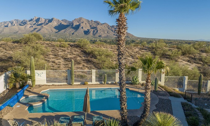 Read my Reviews on the “other” booking site please. Amazing PRIVACY and VIEWS! With No immediate neighbors. Perched high on top of an elevated lot on a hill, a 1 acre lot, this 3-bedroom oasis in Oro Valley provides outstanding privacy and sweeping mountain and city views, Oversized pool and inground Spa.