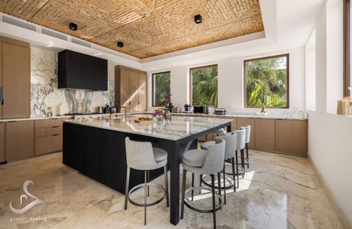 The fully equipped kitchen has a large cabinet in natural European oak wood made in Italy, with natural marble countertops and high-end kitchenware. This space has a large central island with space for 6 people.