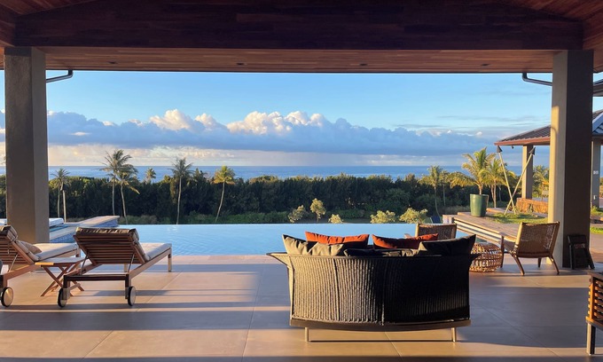 This new construction Kukuiula villa just completed in 2024, Jasmine Villa, showcases expansive views of the ocean, the outstanding Kukui’ula golf course, and the Hapu mountain range, sunrise, and full-moon rise! The Milky way and meteor shower can be easily watched from the lanai, suntan and firepit areas