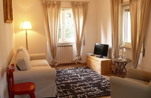Detached house with garden situated in the park of a private villa with the possibility, in summer, to enjoy the pool and play area for children. One bedroom apartment of 50sqm recently restored and furnished with one large bedroom with double bed, 1 comfortable lounge with comfortable sofa bed and equipped kitchen .Rooms view of a garden just 400 square meters fenced in which there is a covered area to have lunch. We welcome the 4-legged friends, there is also a wooden kennel to house them in the garden. Guests are allowed to use the swimming pool of the villa, shared with the owners, and a fenced area for children. E 'dipped in Mentanese countryside between hills of olive groves and nature reserves of great beauty