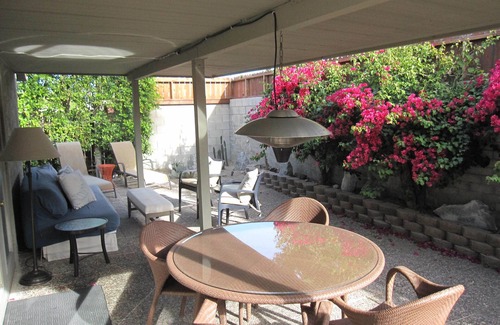 This property is a meticulously well-maintained Zen-like against the raw backdrop of the San Jacinto mountains. It is located in a quiet neighborhood, on the south side of town, easily accessible to restaurants, clubs and all downtown attractions. The apartment is a spacious furnished studio, 1-bath unit, with a large covered private terrace. Beautiful open floor plan, with plenty of natural light, flows out to huge patio with mountain views and complete privacy... Our guests spend most of their time out there reading and relaxing. There is a complimentary laundry facility in the building. The kitchen is fully stocked with cookbook utensils, pots and pans. The property is clothing optional for those wishing to shed their textiles for more relaxation.