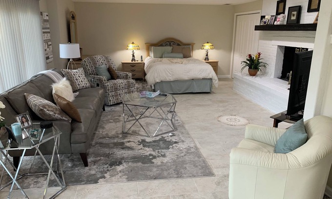 Stunning Inlaw apartment with a fireplace, beautiful country view and setting, walk in shower, heated floors, washer dryer, private parking spot, whirl pool hot tub, close to Lake Geneva and suburbs of Chicago. Perfect for traveling nurses or pilots traveling out of Galt Airport