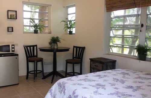 The Vine Room is a studio for 2 or single looking for quiet time by the ocean. Clean, simple, and quiet, this studio has lots of windows, a compact refrigerator, microwave, coffeemaker and air-conditioner as well as 3 ceiling fans. This unit comes with most Estate Amenities such as WiFi, Satellite Dish TV, access to the newly installed swimming pool and on site laundry facilities. Located on a 4 acre estate right in front of the Tres Palmas Marine Reserve, there is plenty of open green spaces and spectacular ocean, sunset and mountain views.