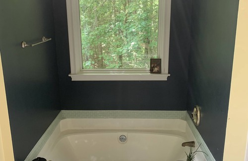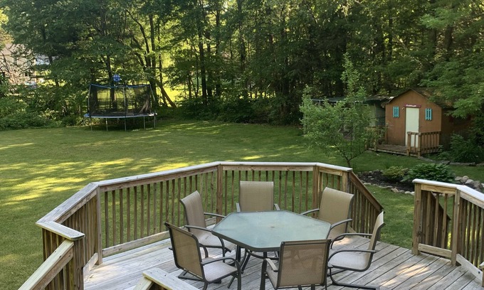 Located in Canton, this comfortable 3 bedroom, 2.5 bath house provides privacy and seclusion, coupled with convenient accessibility to shopping, dining, and recreational activities. With 3 spacious bedrooms, including a king bed, a full bed, and a twin bed, guests are provided comfort and relaxation with ample space. The house features 2.5 bathrooms, complete with a large soaking tub, tub/shower combo, and provided amenities including towels, soaps, shampoos, etc. Living spaces include a den with office space, large living room and sitting area, spacious kitchen with bar counter, and a dining room for 6. Outside features for your enjoyment include an expansive two tiered decked, inflatable 4 person hot tub, swing set, vegetable garden, and fresh eggs from the on-site hens.