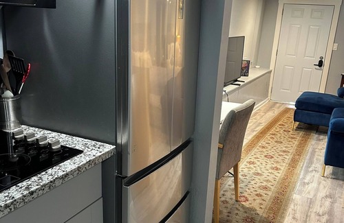 All new efficiency with full kitchen, private entrance, big back yard with BBQ!! on a quiet street, but very close to down town Redwood City and its theaters!!, multiplex cinema, and great restaurants. "Basement" apartment, but with street level entrance covered seating area outside front door. Air conditioner. Owners, empty nest professional couple, livein ADU (new house) at back of lot. Queen size bed, sofa, 55" Amazon Stick TV, brand new upgraded bathroom with bath tub/shower