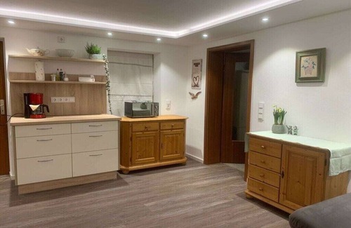 The apartment is 90 sqm. You come directly into the living room with kitchenette (approx. 32 sqm), large corner bench with Jokl table (sliding wooden tabletop), new box spring couch, spacious satellite flat screen, phone + free WiFi. The kitchenette is really complete. The ideal family apartment. A small sink in each bedroom. A bed 2x2 m with comfortable slatted frame and 2 single beds each 1x2m. A TV also in the room. The floor-level shower room (12 sqm) has year-round underfloor heating. (Photovoltaics) Plenty of space for 4-5 people, modern flower terrace, small lawn and spacious parking for at least 2 cars directly at your apartment.