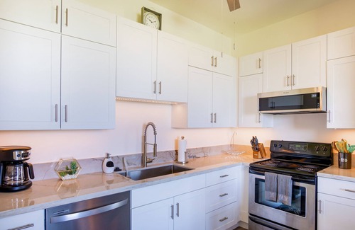 Downtime spent indoors will be a blast as well with the bright interior, high-end furnishings, and free WiFi throughout. Don't worry about dining out each evening, as you can easily bring along your favorite recipes and practice your culinary skills in the full kitchen, complete with quartz countertops, stainless steel appliances, a coffee maker, and all the cookware and accessories you are used to. Evening fun will be easy to come by as well, with ample board games, cable, and Roku-enabled TVs for streaming your favorite programs. When nights come to a close, the comfortable bedroom is waiting to provide you with a long and rejuvenating sleep, and the living room's Murphy bed will accommodate extra guests.
