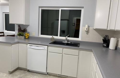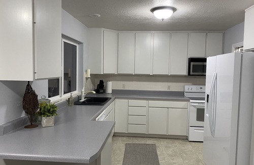 The house has a mud/ laundry room with washer/dryer for your use, kitchen, dining room, 1/2 bathroom, great room with windows that bringing the outdoors in and a large HD flat screen smart TV with Apple TV. On the main floor there are two master bedroom with a KING bed in one and a KING and QUEEN in the other. They both have large bathrooms attached. One has a shower/tub and the other has a separate shower and huge jetted tub. Downstairs you will find two more bedrooms. One with a KING and the other with a Queen. There is one bathroom with a walk in shower. In the walk out basement you will also find a game room with a basketball game, football table, ping pong table and a second tv with direct tv. One of the couches pulls out to a full size bed.