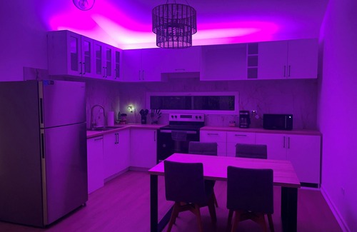 The comfortable living room features a sofa bed, smart TV, Wi-Fi, and central air, ensuring maximum comfort during your stay. Additionally, we offer private parking for up to 5 vehicles.