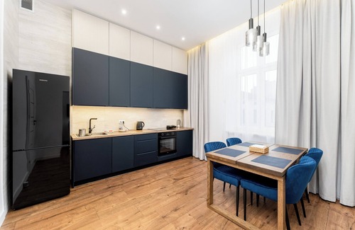 Józefińska Deluxe Studio is a stylishly furnished apartment featuring a room with a comfortable king-size bed and a desk, allowing for study or remote work, a kitchenette, and a bathroom. It offers a range of amenities, including free WiFi, terrestrial TV, a washing machine, a hairdryer, an iron, a fridge with a freezer, a kettle, a dishwasher, an oven, a toaster, and kitchen accessories.
