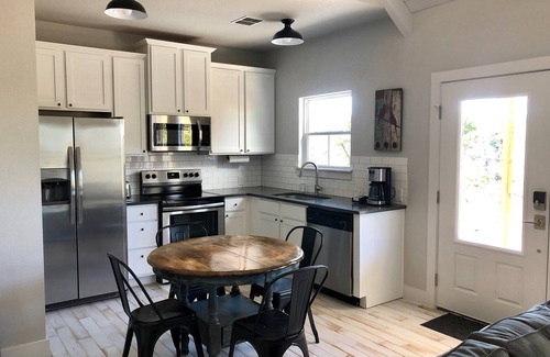 Plan to relax and rejuvenate while staying in one of our farmhouses. Imagine sipping freshly brewed coffee in rocking chairs on the front porch, admiring the Hill Country view. Take a five minute drive along the Blanco River into town for shops, restaurants, and activities. When you return for the evening, have an iced cold Shiner beer while you kick back and savor the sunset and stargazing. Enjoy the plush, Magnolia Home inspired, furnishings and decor in our modern farmhouse. Jackrabbit is beautiful and cozy with a well appointed, full kitchen - a real luxury retreat.