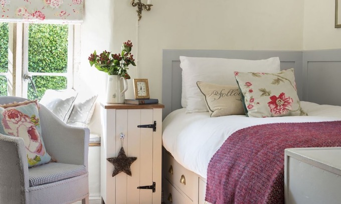 Enter this pretty cottage into a light-filled hallway with stone flooring, mullion window and plenty of space for muddy boots and coats. Through the latch door is a cosy sitting room, with exposed beams, two mullion windows, a window seat to watch the world go by, and of course, the beautiful stone fireplace with wood burning stove laid up and ready to light on your arrival. The cottage kitchen is to the rear of the property and, although small, is filled with light and well-equipped with everything you'll need to prepare and enjoy the wonderful local produce on offer. A small dining area in the kitchen leads you out to the charming patio with garden furniture where you can enjoy al-fresco meals on warm summer days whilst admiring the wonderful garden foliage and flowers which surround you. Climb a few steps up to the main garden area, mostly laid to lawn with herbaceous borders with a bistro table and chairs. Parents will need to be mindful here of a 5' drop back down to the patio area, shielded by a hedge.