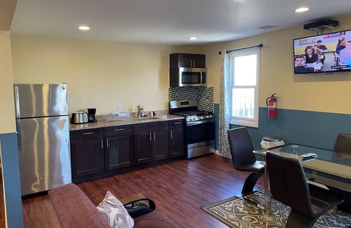While you're here, you can enjoy all the comforts of home and more, including a rainfall showerhead and a refrigerator, as well as an oven and a stovetop. Other amenities include towels, kitchenware and utensils, a toaster, and a dining area.