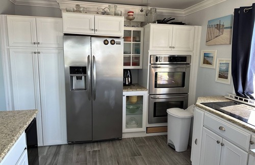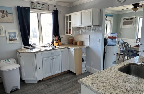 A FIVE STAR Rated “Premier Property” Owner/Manager bring you yet another amazing vacation getaway on the Jersey Shore! From the moment you arrive you will hear the seagulls and know you are on vacation! This waterfront home is centrally located between Long Beach Island to the South and Lavalette beaches to the North on a wide lagoon and a straight shot across the Bay to the epic and popular “Tices Shoal” a boaters paradise! From there you are just a short walk to the Ocean on Island Beach State Park. If you decide to rent a boat or jetski you are able to dock it right in the backyard, or enjoy some of the many kayaks or the paddleboat provided for you. Fell like peddling to the Bay Beach? There are bicycles provided for your cruising pleasure! Enjoy your drinks at the tiki bar, in the hot tub, or after bbq’ing and enjoying your favorite dish at any of the tiki umbrellaed tables or loungers. A true Island feel. If you ever decide to go inside you will find a state of the art kitchen with cooktop, double ovens, & wine fridge! A full coffee station/ wet bar to fulfill all your beverage needs. Head to the bathroom where you can enjoy the jet tub, rain shower, or body jets while listening to your favorite tunes on the in shower radio speakers. With two bedrooms containing comfort firm mattresses and plenty of drawer and closet space, you’ll find yourself in comfort around every turn.