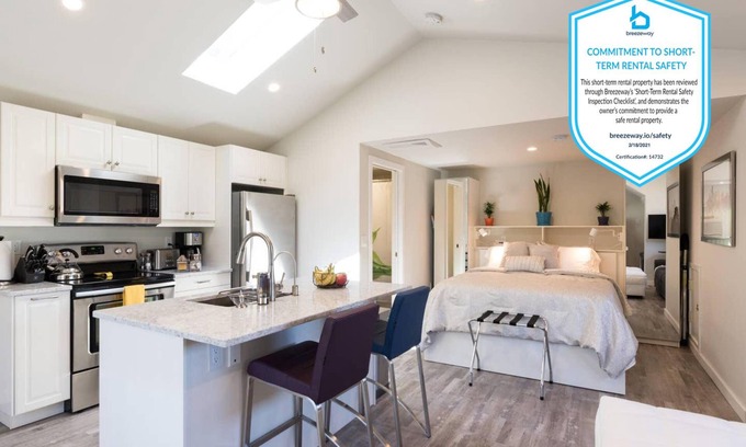 Enjoy the ease and comfort that consistently earns our property 5 star reviews, usually praising the extreme cleanliness, unique amenities and high-touch hosting. Guests appreciate our thoughtful labels and comprehensive printed guidebook, making it easy to navigate and enjoy the amenities we provide. Guests also love the free high-speed Wi-Fi, heat & A/C, adjustable ceiling fan, dimmable lights, indoor air-purifying plants and a quiet air-exchange filtering system.