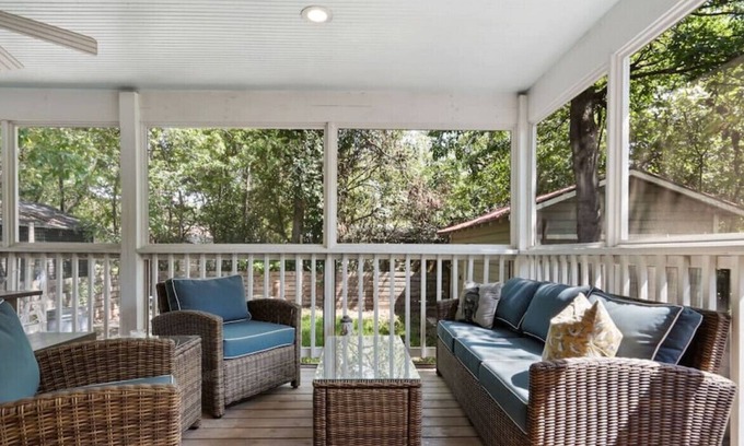 Make this chic, centrally located house your home base after indulging in everything the Brentwood neighborhood has to offer. Enjoy Austin’s beloved bars, breweries, live music venues, and eateries all a walk, scooter, or Uber away. This house comfortably welcomes six guests who want a cozy retreat with two in the primary queen bedroom that has a door leading to the screened-in porch. The second bedroom comfortably sleeps four more, with two in a queen bed and two in a twin with a trundle bed. Extra pillows and bedding are available for use with the trundle bed!