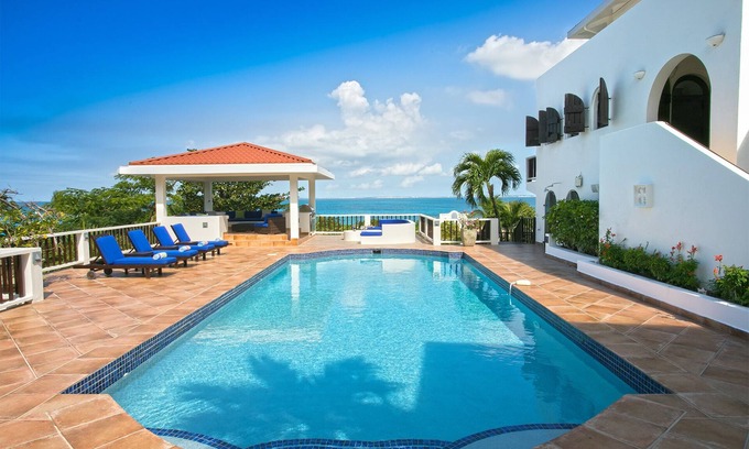 Upper levels house the main living spaces including an elegant outside lounge with ceiling fans and a fabulous panoramic view over the ocean and the nearby island of Anguilla. An arched balcony runs the length of this level opening out from a dining and living area and a large, well-equipped mahogany kitchen with generous counter space and a central island.