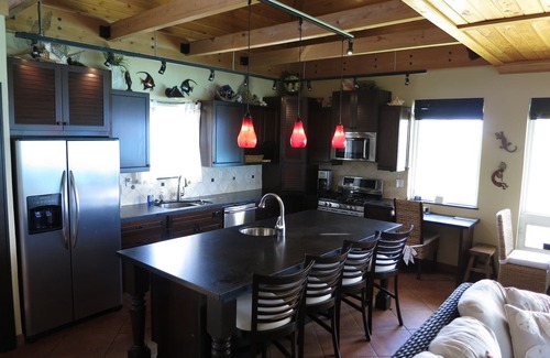 There are many wonderful restaurants on the island and are provided in our guest book. If you like to cook in a gourmet kitchen, you can buy fresh fish most days at the harbour dock or wave or kayak to the fisherman in front of Jolly Mon to bring a fresh catch.