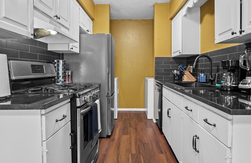 The kitchen includes a full-sized refrigerator, oven, stove, microwave, and dishwasher, as well as smaller appliances like a coffee maker, toaster, and blender. High-quality cookware and utensils ensure that you can easily prepare anything from a simple snack to a gourmet dinner.