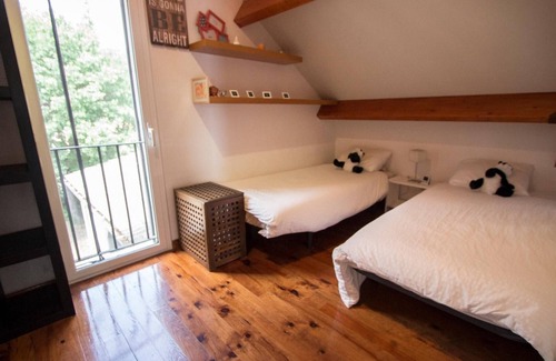 Climb the spiral stairs to the second floor to find the three remaining bedrooms, two of which have one double bed each and one of which has two single beds. There is also a second living room with sofas and another dining table. The bed sizes are as follows: 100x200 cm for single beds and 130x200 cm for double bed