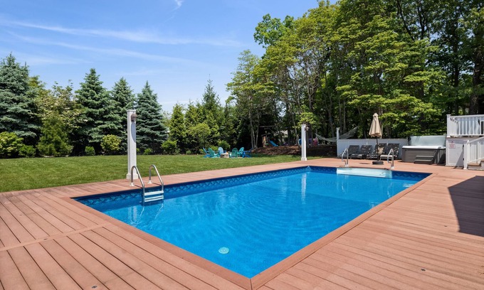 Doors off the main social areas lead to a nice screened porch and expansive deck with BBQ overlooking the heated pool, fire pit, and play equipment for kids. Outdoor seating includes a table for 4 as well as a large table with bench seating for 8-10. There is also a gas grill on the outside deck.