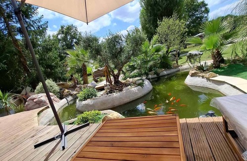 Jurassic cottage in a green setting with koi pond | Cabin in Marsas