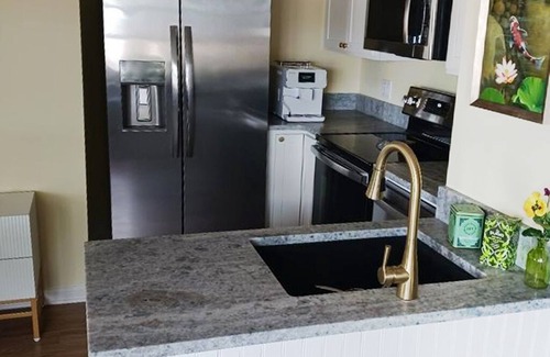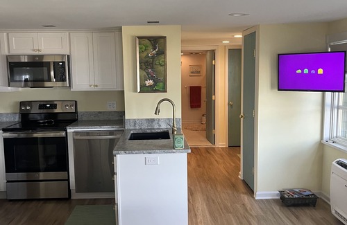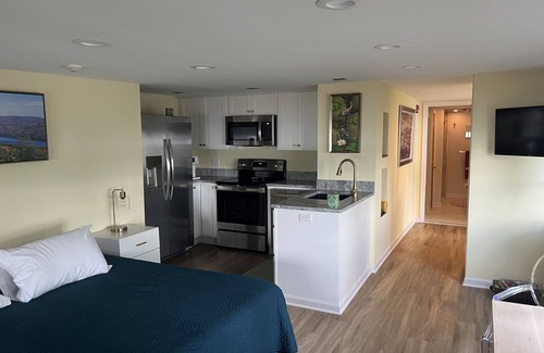 Our cozy brand new first floor studio at Snug Harbor is located right at the water level! Surrounded by landscaping, enjoy amazing sunrises from the comfortable Puffy adjustable King Bed or from your own private porch. While sharing a wall with Snug Harbor restaurant, the fully equipped kitchen is designed to maximize the space. Featuring a gas stove, french door refrigerator with ice & water, microwave, and a coffee maker nearby.