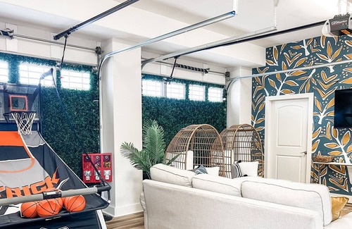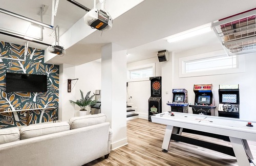 GAME ROOM - There is an outside entrance and an entrance from the first floor to the large garage that was converted into a game room and hang out are. There is Air Hockey, Pop A Shot basketball, Electronic Dartboard (soft tip), 3 Arcade 1up video games and a candy vending machine. There is a seating area w/ a couch, 2 egg chairs and a 55" TV.