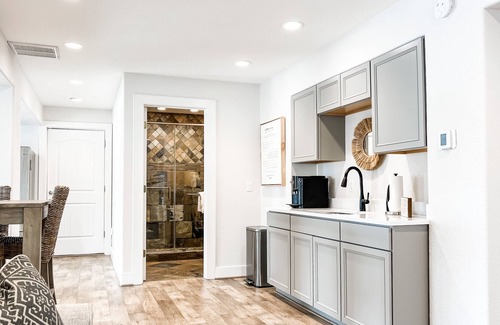 1ST FLOOR - Opens up from the pool area to a downstairs Living Room with a wet bar, full size fridge, queen sofa couch and 55" tv with Super Nintendo. A full bathroom and bedroom w/ Queen bed are located on this floor as well. You will find a door that leads to the garage converted to Game Room.