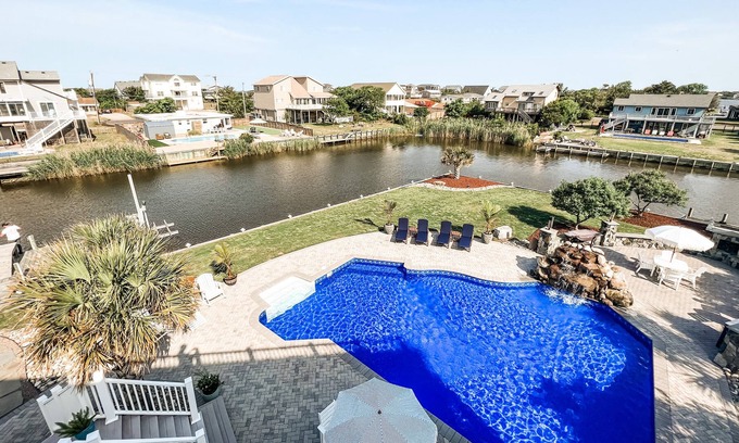 One of the most luxurious and modern waterfront homes in Sandbridge has now become available to host an unforgettable vacation for your family this summer. Our large backyard features a huge pool w/rock feature, large firepit/chimney area with abundant seating and two docks to launch kayaks or fish from. Inside the home you'll have plenty of room to entertain in our 5300 sf home with 3 levels. Tons of balconies and porches, time to start relaxing!