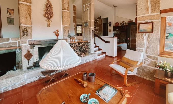Sunset over the Minho River and Ilha dos Amores!This house is located 5 minutes from the centre of Vila Nova de Cerveira. It has a beautiful architecture, with the living room, dining room, kitchen and games room distributed in open space but divided in different heights. The Minho River enters through the large windows and paints the rooms with its sparkling reflections. It accommodates eight people: two bedrooms with double single beds and two suites with double bed.The outdoor area also has a large barbecue, swimming pool and dining area.