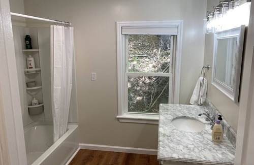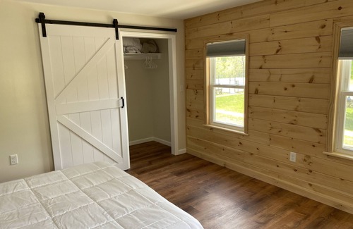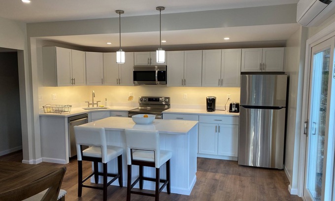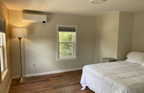 This house was just renovated and everything is new, modern and clean. The house looks like brand new construction. It has modern conveniences (quartz kitchen counters, stainless steel kitchen appliances including dishwasher, washer and dryer, air conditioning throughout) but with Adirondack charm with pine on the accent walls and a front porch in the downtown of the town of Lake Luzerne.
