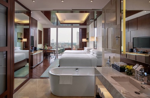 JW Marriott Hotel Hanoi offers 450 air-conditioned accommodations with iPod docking stations and minibars. 42-inch LCD televisions come with cable channels. Bathrooms include separate bathtubs and showers with rainfall showerheads, bathrobes, slippers, and designer toiletries.