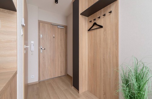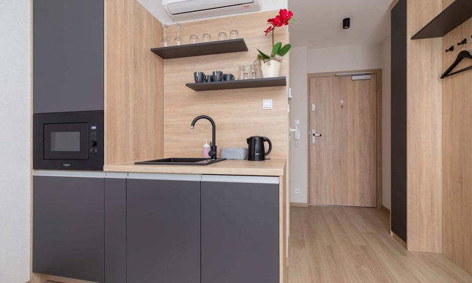 The studio apartment can accommodate 2 people. It consists of a seating area with a sofa bed and a TV set, a fully equipped kitchenette, a hall and a bathroom with a shower and a toilet. It is a great solution for a couple or for a business trip! Guests can use a welcome set of toiletries (soap, shampoo and shower gel), towels and household items such as an iron or a vacuum cleaner. The apartment also has access to free high-speed Wifi Internet. Modern design and comprehensive equipment with necessary kitchen and bathroom accessories guarantee a comfortable stay. There is a laundry room in the building for guests to use - free of charge. The property does not provide a parking space, but there is a paid parking zone next to it where you can leave your car. The space of the apartment is functionally designed, meeting all the needs of guests. Visitors can comfortably work remotely at an available desk with a chair. We also invite guests traveling with pets, because it is a pet-friendly apartment (PLN 100/Stay).