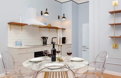 This fully equipped apartment can accommodate 4 people and is perfect for those who like to travel in style. The apartment consists of a living room with kitchenette, a bedroom and a bathroom with a bathtub. The unique décor of the place, just like the apartment building, combines modern aesthetics with timeless elegance. Pastel colors with gold elements create an atmosphere of chic without being pretentious, forming a space where everyone will feel comfortable. This comfort is enhanced by a wide range of amenities – full kitchen and bathroom facilities, free Wi-Fi, and a flat-screen Smart TV with access to cable channels and Netflix.