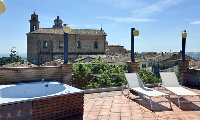 Large terrace equipped with table and chairs, deckchairs and awning, hydro-massage tub and panoramic view of the marvellous Marche hills.
