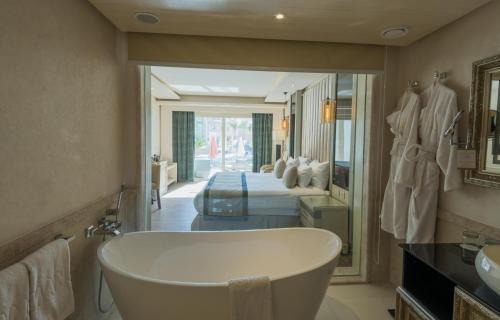 Food & DrinkTea/Coffee maker, Minibar, Bottle of waterBathroomFree toiletries, Bathrobe, Shower, Private bathroom, Slippers, Bathtub or shower, Toilet paper, Body soap, Shampoo, Hairdryer, Bathtub, Bidet, Conditioner, Shower cap, Toilet, TowelsGeneralPrivate entrance, Tile/Marble floor, Carpeted, Trash cans, Ironing facilities, Air conditioning, Heating, SafeMedia & TechnologySatellite channels, Flat-screen TV, TelephoneOutdoorsBalcony, TerraceLiving AreaSitting area, DeskViewView, Sea viewServicesWake-up serviceKitchenElectric kettleBedroomLinens, Wardrobe or closetRoom AmenitiesNon-feather pillow, Clothes rackAccessibilityRoll-in showerPool and SpaPool towels |