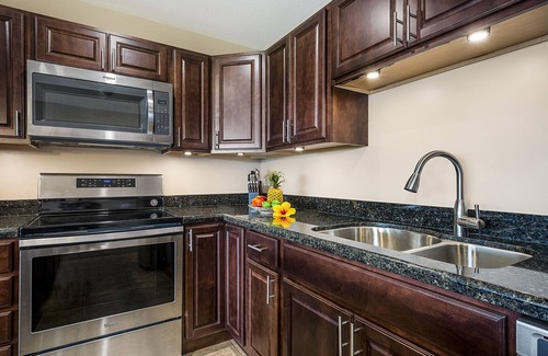 The fully remodeled kitchen features rich cabinetry, granite countertops, and stainless steel appliances. From morning Kona coffee to fresh-caught fish on the stove, everything you need to prepare meals is here—including a blender, rice cooker, and barbecue tools for the complex grills.