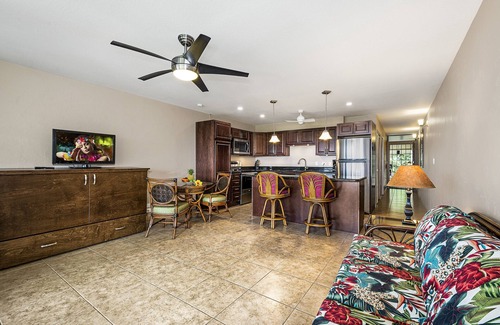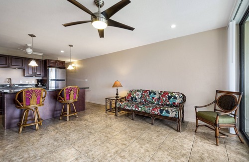 The open living area feels bright and relaxed, styled with tropical touches and cool tile floors. A ceiling fan and split A/C keep the space comfortable after a day in the sun. The living room flows seamlessly to the lanai, with sliding doors that invite in island breezes. A dining table and breakfast bar provide options for casual meals or laptop-friendly work time.