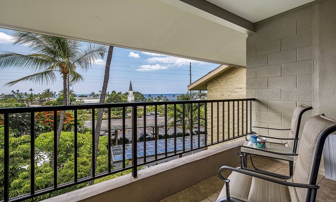Stay in the heart of Kona town at Kalanikai 306, a recently remodeled 1-bedroom, 1-bath condo that blends cool comfort with a walk-everywhere location. From your top-floor lanai, enjoy tranquil views of the pool framed by palms, with the Pacific glimmering beyond. With air conditioning throughout, thoughtful updates, and a smart layout that sleeps up to four, this vacation home is designed for couples, small families, or even digital nomads seeking a central base on the Kona Coast.