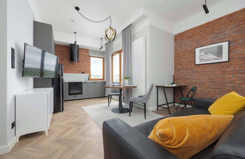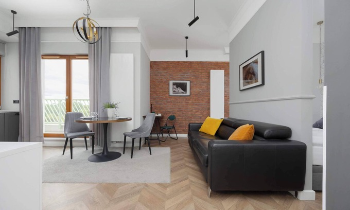 The bright, spacious studio designed for four people has a relaxed, friendly atmosphere that encourages you to stay longer from the very beginning. The interior combines modern functionality with delicate, warm accents, thanks to which it is easy to feel at home here. Large windows let in daylight, and the exit to the balcony allows you to get some fresh air and look at the city from a distance. The well-thought-out layout of the space provides comfortable conditions for both a couple and a family with children. The living and sleeping areas combine here into a harmonious whole. A comfortable bed and a large, fold-out sofa guarantee a good night's sleep and a place to relax together. The modern kitchen has been fully equipped, thanks to which preparing meals, morning coffee or dinner after a day full of sightseeing takes place in favorable conditions. Everything has been designed with everyday use in mind - there is plenty of storage space, a separate work area with a desk and a table where you can eat a meal, play board games or just talk. The bathroom with a shower has been designed with great attention to aesthetics and comfort of use. There is a hairdryer and all the necessary elements that make everyday life easier. The apartment also has a TV with access to streaming platforms and fast Wi-Fi, which allows both entertainment and remote work. Guests can also use a fan, which can be removed from the wardrobe if necessary. The facility is located in a modern building with an elevator, and an additional convenience is access to underground parking. This place combines everything you need for a peaceful rest in the city - comfort, aesthetics and a good location. Ideal for joint trips for two or family stays with children.