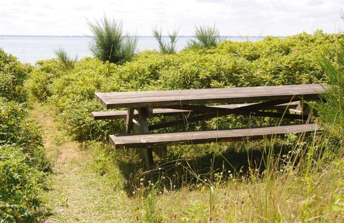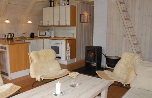 "Kalv" - 75m from the sea", 2-room house 54 m2. Object suitable for 6 adults + 1 child. Living room with 1 double sofabed, TV, radio, hi-fi system and DVD. 1 room with 2 sofabeds. Kitchen (oven, dishwasher, 4 ceramic glass hob hotplates, microwave, freezer). Shower/WC. Upper floor: open gallery with 2 sleeping facilities. Terrace 8 m2, roofed. Of the bay. Facilities: children's high chair, baby cot. Internet (WiFi). Please note: non-smokers only. 540-16787