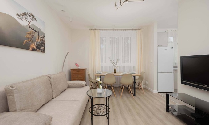 This spacious apartment at Kameralna 3 is the perfect place for families or groups of up to five people who value comfort and a quiet location with quick access to Warsaw city center. The bright, functional interior encourages relaxation, while the living room with a kitchenette and Smart TV creates a cozy space for spending time together. The fully equipped kitchen allows for preparing home-cooked meals, and two bedrooms provide comfort and privacy.