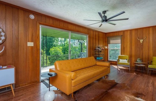 This midcentury modern getaway is located in the heart of NC's amazing waterfall and hiking landscape. Sitting on 4.5 acres you can enjoy an on property stream that flows down from the Great Balsam Mountain Range, hiking in the woods, and fire pit.